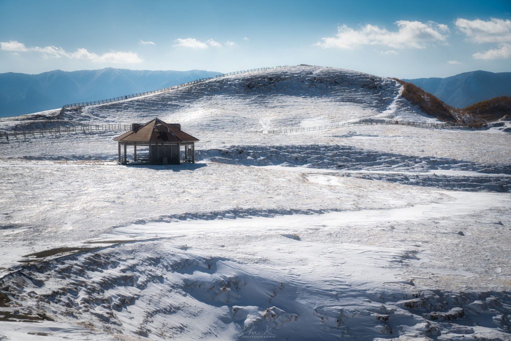 In winter, Aso Kuju National Park in Kumamoto Prefecture transforms into a silent, dreamlike world. Snow blankets the volcanic peaks, golden reeds shimmer in the sunlight, and the clear highland sky creates a scene that is both wild and romantic. The land seems frozen in the breath of winter, evoking serenity and depth.