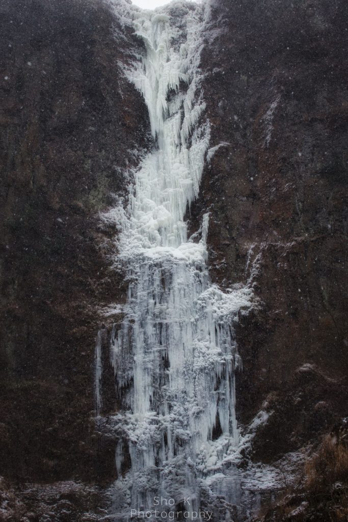 C5: Capture the scene from behind the waterfall — the soft flow of water glows beautifully against the winter light.