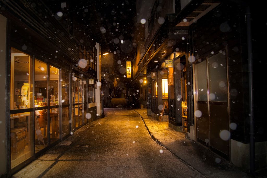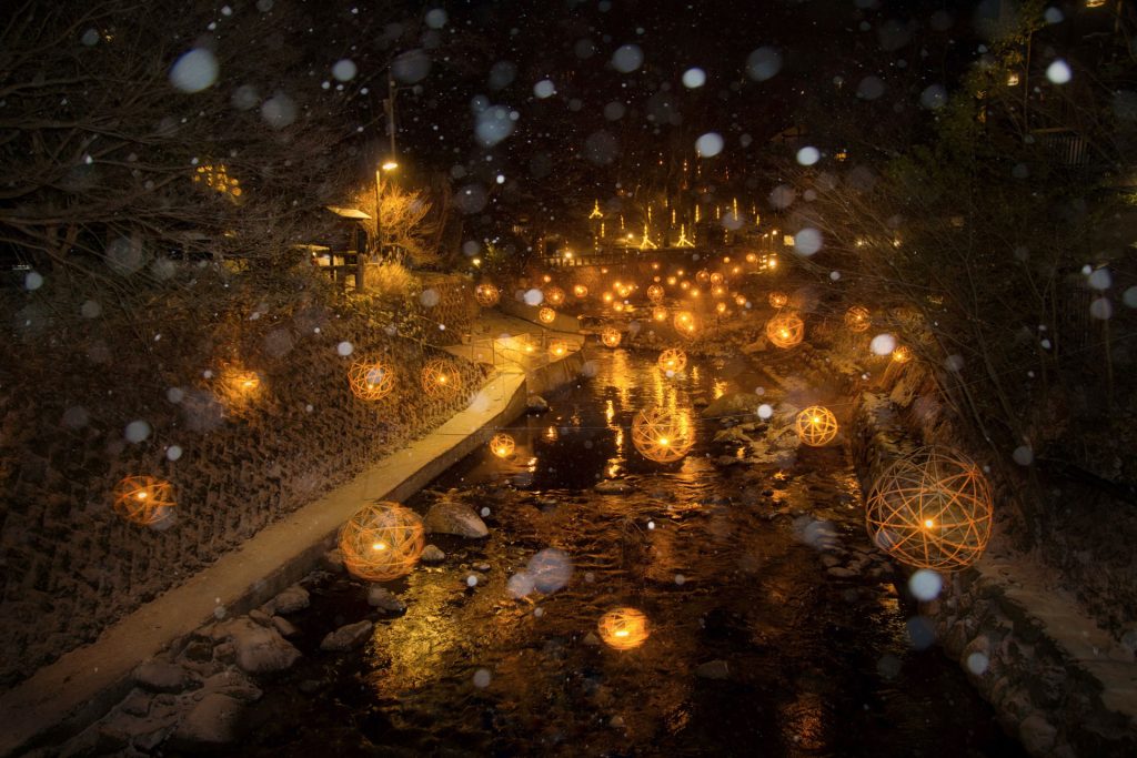 C4: Capture the Yuakari lantern lights at Kurokawa Onsen – a poetic winter night scene.