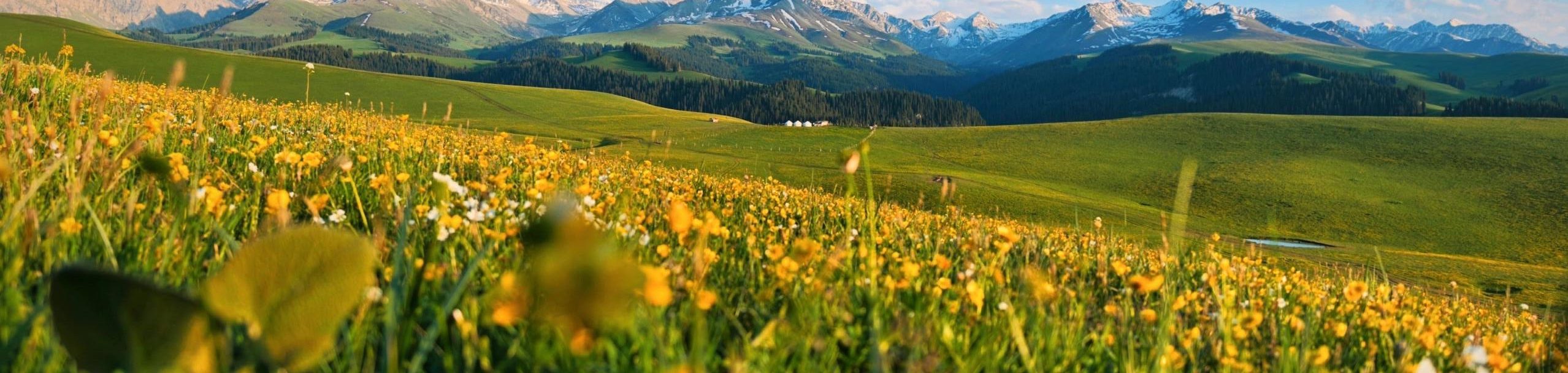 From June to August, fields of golden rapeseed flowers bloom beneath snow mountains, where glacial streams from Hata merge with grasslands — a true paradise for photographers.