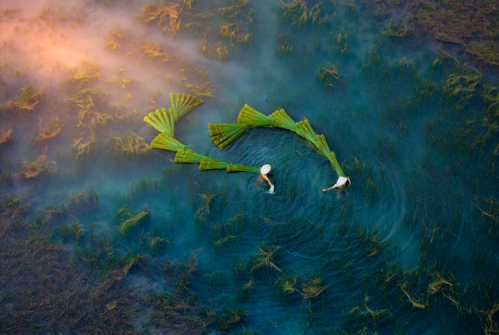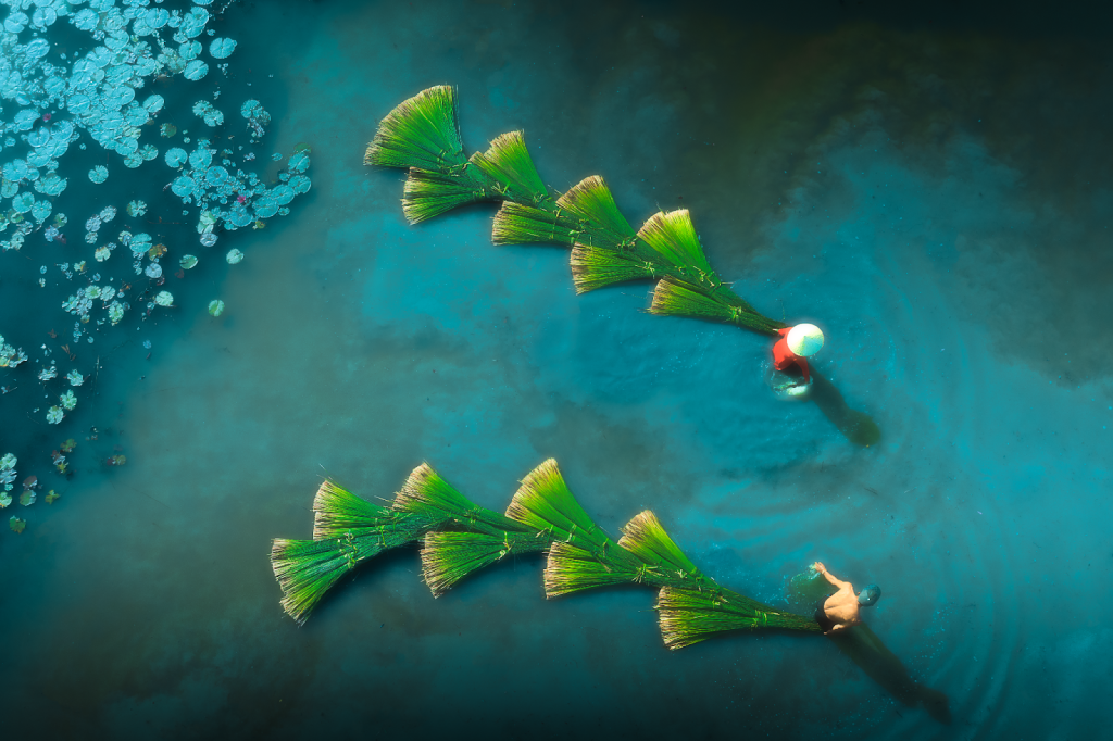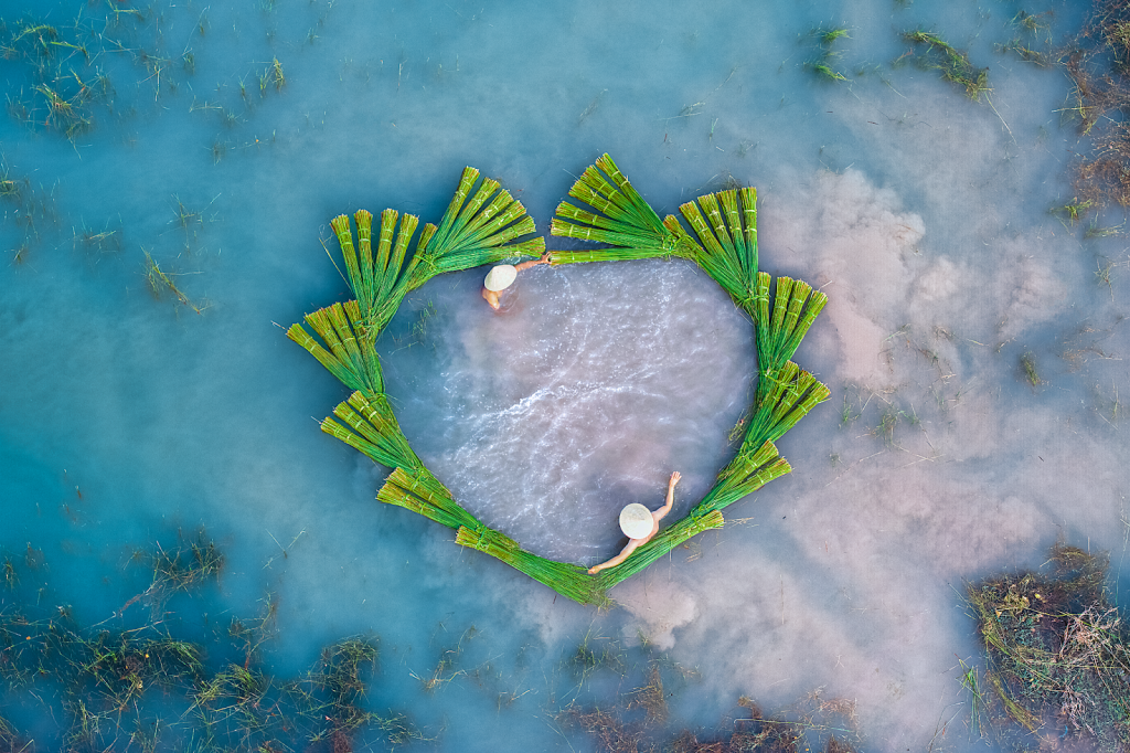 The image of farmers wearing conical hats, wading through water to pull heavy bundles of grass, is the clearest evidence of the resilience and hard work of the people in the riverine region. More than just a strenuous job to earn a living, they also imbue it with love and creativity. The moment two farmers skillfully arrange bundles of sedge grass into a heart shape in the water is not only a beautiful shot but also a symbol of their love of labor and their connection to their homeland.