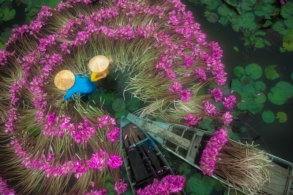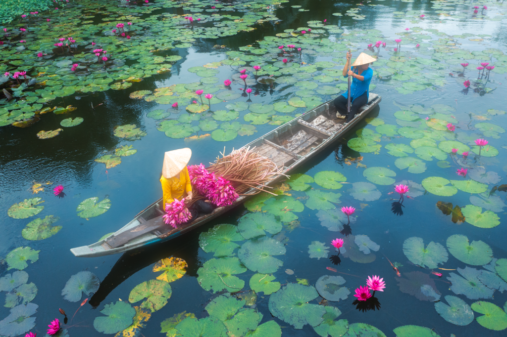 Water lilies grow naturally or are cultivated in the low-lying wetlands of Long An, An Giang, and Dong Thap provinces. The highlight of photography tours during this season is the moment when Mekong Delta women, dressed in traditional “áo bà ba” and conical hats, paddle their small boats to harvest water lilies. The long, fleshy stems bundled into circular arrangements floating on the river’s surface form perfect geometric compositions — especially striking when captured from above by drone photography.